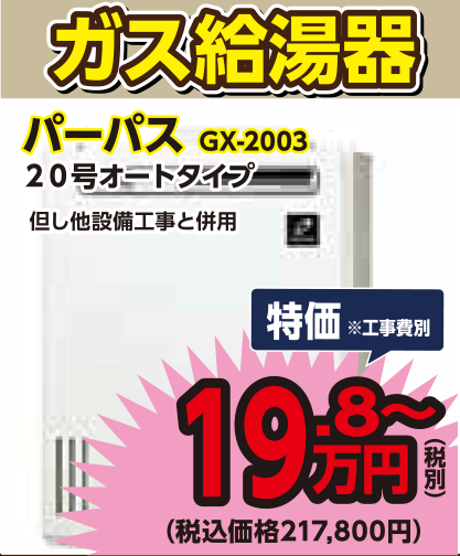 給湯器・エコキュートリフォーム リフォームメニュー 2024.05.30 (Thu) 更新 パナソニックのエコキュートの詳細はコチラ パーパスのガス給湯器の詳細はコチラ ※価格、取り扱い等は変更する場合がありますので、スタッフにご確認ください。