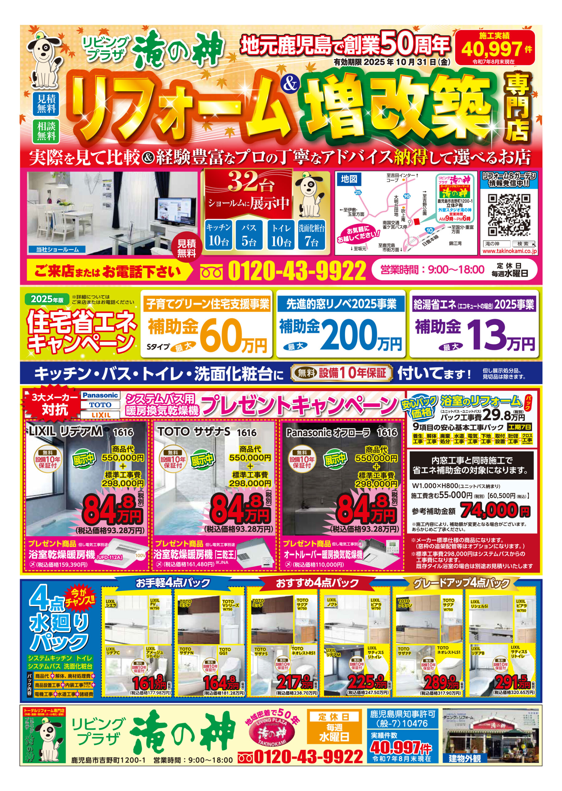 お得なチラシ【2025年10月31日まで】住宅省エネ補助金(2025年版)キャンペーン実施中!3大メーカー(Panasonic・TOTO・LIXIL)対抗★システムバス用暖房換気乾燥機プレゼントキャンペーン!お見積・ご相談無料で承ります【鹿児島市・姶良市・伊集院地区のリフォーム・リノベーション・外壁塗装・屋根塗装・エクステリア・ガーデン】