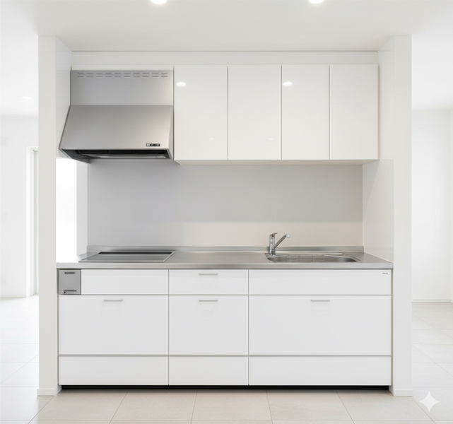 フェイス:シルバー、トップ:ホワイト。3口コンロ・ホーロートップタイプ(無水片面焼きグリル)。レンジフード連動なし。