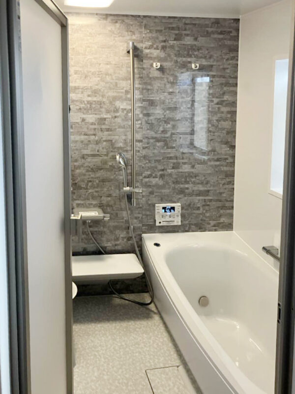 今回のリフォームでは、TOTOサザナSタイプを採用し、落ち着いたグレーのアクセントパネルでホテルのような上質感のある浴室に仕上げました。